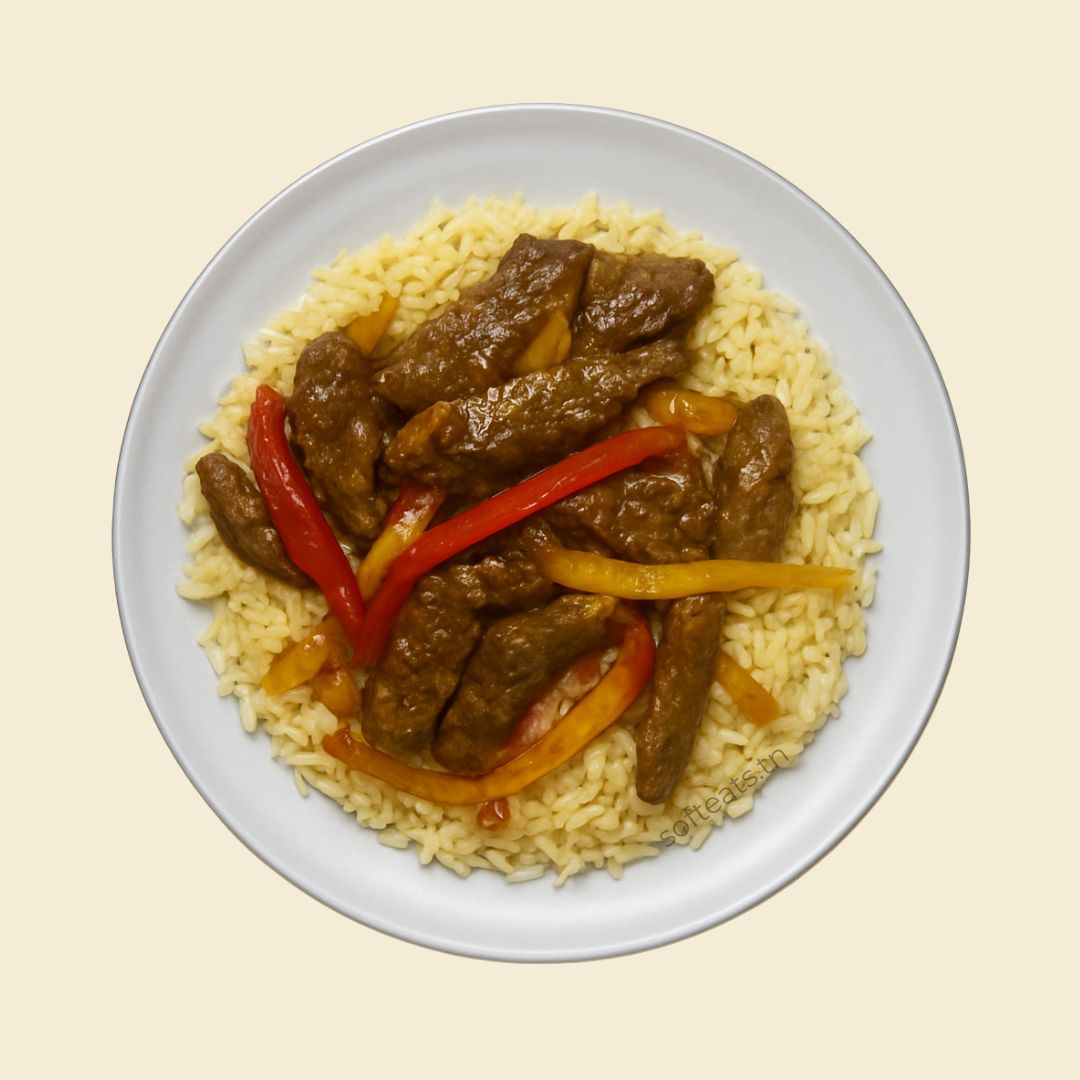 Ce plat est composé de fines tranches de foie de bœuf frais marinées et saisies à feu vif, accompagnées de lanières de poivrons rouges et jaunes revenues à l'huile d'olive, d'oignons caramélisés et d'une sauce maison légèrement épicée. Le tout est servi sur un lit de riz long grain cuit au bouillon, parfumé au curcuma et au cumin pour une belle couleur dorée.