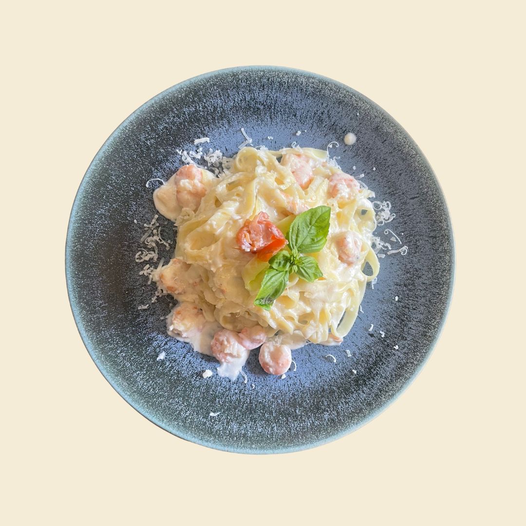 Ce plat est composé de tagliatelles cuites al dente nappées d'une sauce crémeuse à base de crème fraîche épaisse et d'ail doré, accompagnées de crevettes roses sautées à l'huile d'olive, d'une tomate cerise fraîche, d'une feuille de basilic frais et généreusement saupoudrées de parmesan râpé au moment du service pour une touche finale raffinée et gourmande.