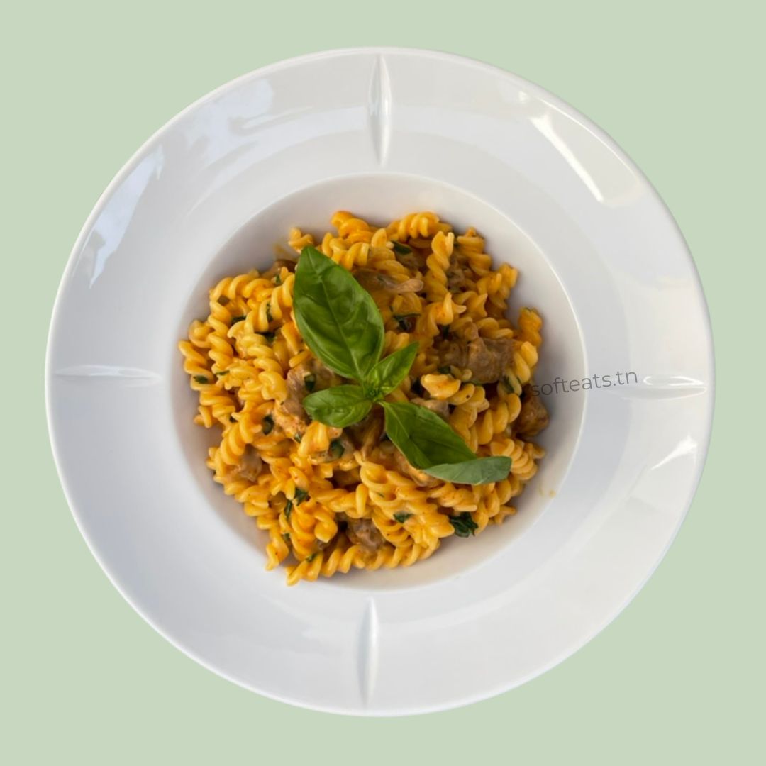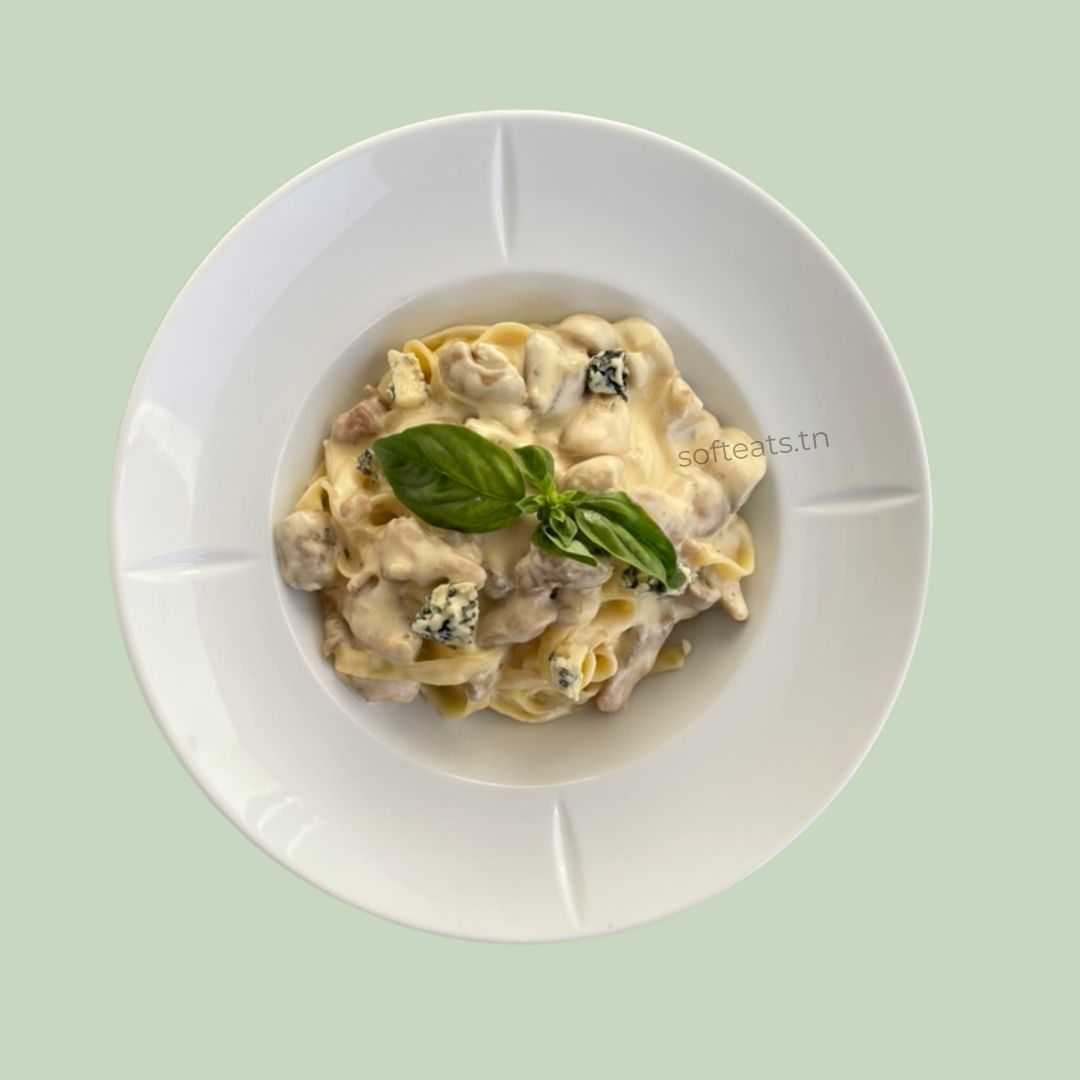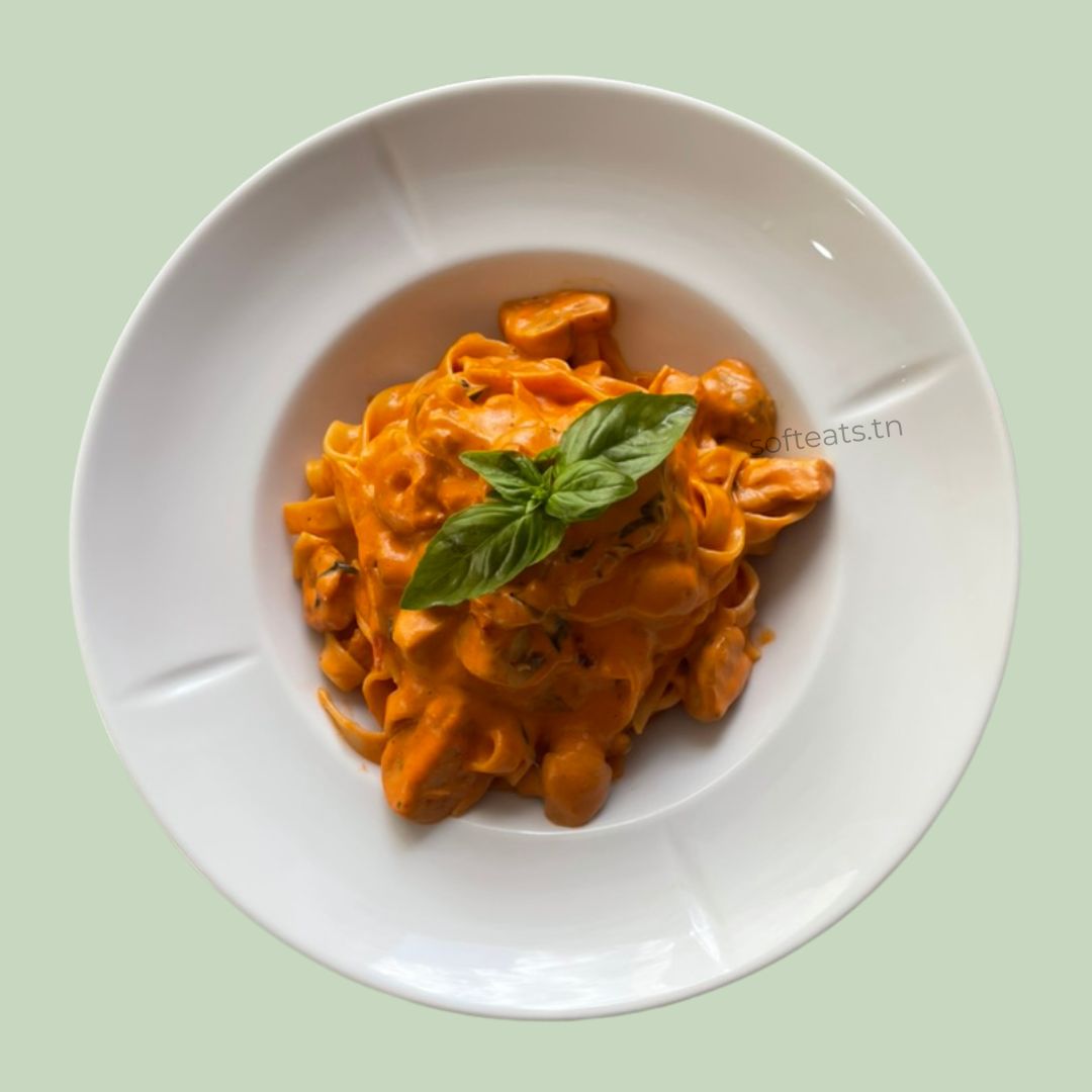 De délicates tagliatelles fraîches enrobées d'une sauce crémeuse onctueuse, généreusement garnies de crevettes roses tendres, de tomates cerises et d'une feuille de basilic frais. Un plat italien raffiné livré directement chez vous à Tunis.